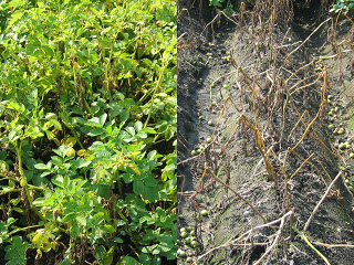| 殺菌剤無散布における疫病の比較 左:さやあかね 右:さやか(2005. 8.31北見農試) |